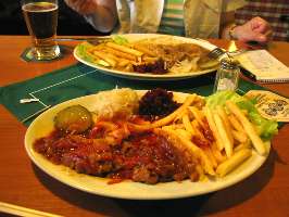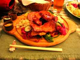 7月13日(月) ポーランドを大都市に出ないで東に進もうと思うと大変で、一度チェコに戻った方が便利。そこで再度国境を越えてチェコに走ります。しかし、毎日1回は国境越えしてるな(^_^ゞ この日の宿はUsti nad Orliciという街の町外れにあるペンションHURKA。 お勧め料理頼んだら、いろんなハムやソーセージを焼いた盛り合わせが来ました。酒のつまみには最高です(^^ |