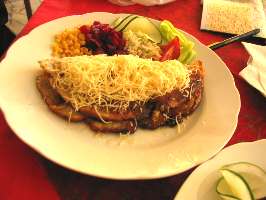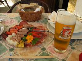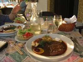 | 歴史の街Mariborの南に車で10分、少し山手に入った所にZg Polskavaという小さな部落があり、そこにGostilna Kalanガストホフ・レストランがありました。宿の女将さんに、土地のものをお任せでお願いしたら、前菜、スープ、メインとコースで持ってきてくれました。おいしい(^^ この地方はワインとハムの産地。本当においしい夕食だ。 | ![]() ![]() |