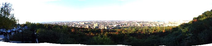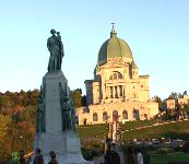 冒頭の写真のメープル街道を通って、オリンピックが開催されたモントリオールの町へやってきました。(写真上)写真では見難いのですが、オリンピック会場が見えました。紅葉も綺麗でしたよ。 右は、モントリオールの市内で見つけた寺院です。モスク風の建物で、その前では何とかと言う歌手のプロモーションビデオを撮影していました。大勢の野次馬の中で歌う根性は、たいしたものですね。 |