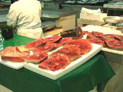 話には聞いていたけど、向うのマグロの切り方って輪切りなんですね(^_^ゞちなみに、一緒に置いてある大トロ、あちらではゴミです\(_