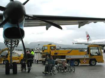 9月26日(金)晴れ 実は車椅子の多さにクロアチア航空が乗船拒否してきました。連絡があったのは、出発一ヶ月前を切ってから。何と、クロアチア航空のコンピューターがウィルスにやられて、連絡できなかったんだって(^^メ) |