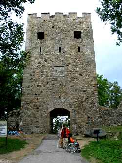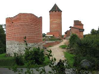 砂利道と木の橋を渡って行きます。車椅子でも大丈夫。 泉の水は鉱物が結構多いので、あまり大量には飲まないことをお勧めします。 ★入場無料 ・ スィグルダ城址 (下右) 城門ぐらいしか残っていません。 |