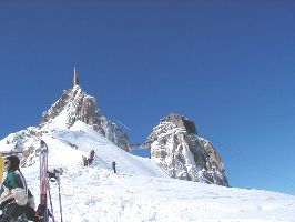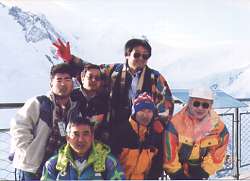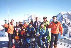 モンブランをバックに。。。見えませんね(^_^ゞ 泊まったホテルにフロントデスクがある「インターナショナル・スキースクール」には日本語が話せるガイドさんがいます。その中でも上の写真左のセルジュ・デュランデルは、キロメーターランセで213Km/hを出し、一時は世界一に輝いた男です。とてつもなくスリリングで、とてつもなく楽しいスキーを一緒にしました。 |
