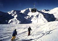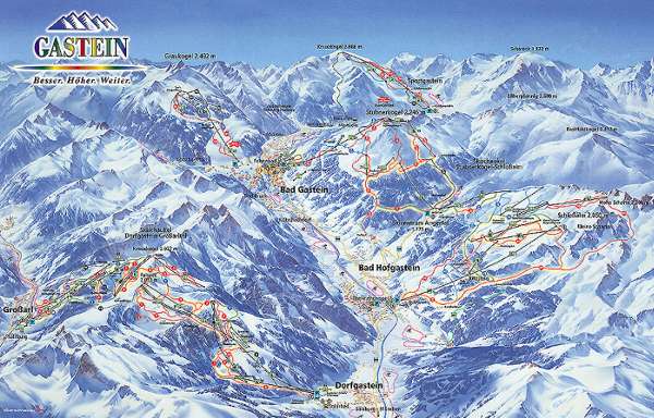エリアの詳しい地図は、上のエリアマップをクリックして見てください。晴れるとダイヤモンドダストが出るぐらい寒いので、温かくしてお出かけください。 メインエリアは登山列車(30°ぐらいの角度で登っていくので最初から斜めになってる)で上り、そこからゴンドラで一本でオープンスロープに出ます。そこから街まで裏周りで下りると16Km...足慣らしにはハードでした(^_^ゞ 個人的に滑って楽しいのは、入り口にあるDorfgasteinエリア。二つの谷二つの街にまたがり、違った文化を楽しむことができます。 |