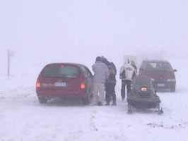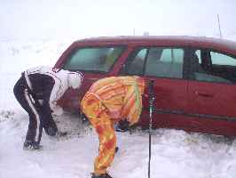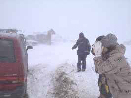 さて、準備が整い、やっとスキー場にたどり着くと...なんと地吹雪によるホワイトアウト状態で、何にも見えないよ〜ん(T-T)おまけに数回車が雪に埋まってしまって、掘り起こすだけで大変。車と一緒にスノーモービルが走ってるんだから大変です。なので思いっきり逃げ帰って市内観光に切替え決定。 |