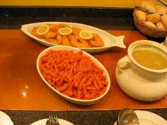 この日のホテルの食事です。 毎日バイキングでデザートからメインまで一気に出揃ってしまいます。はっきり言って情緒も何も無いので、疲れちゃいますよね。並ばなくてはいけないし。やはり通常のスタイルが一番です。 |