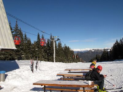 早速山頂に向かったのですが、なぜか山頂Jバーが動かない。仕方がないので前日滑っていない場所を探して滑ります。そこで見つけた赤いゴンドラは、今にも落ちるのでは?と思うほど骨董品で狭い(^_^ゞおまけにドアも完全には閉まらないんだよ〜(ToT) このJasnaはバーは何件もあったけど、あまりレストランはなさそう。みんなホテルの中かな?