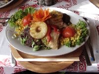 ホテルの食事は本館まで行って食べます。★★ですから服装も自由で、すごくアットホーム。 メニューはサラダ、前菜、メイン、デザートと食べ放題で、これは四つ星ホテルも一緒だと言うことでしたから、スロバキアのスタイルなのかな? で一番特筆すべきなのは、味付けが淡く、そして余計な味を付けないので、とても日本人の口に合っておいしいっ!おまけにご飯もあるので、普通の日本定食のように食べる事ができるんですよ(^^ 二日目はすごくいい天気(^^