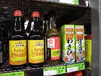 昨晩降っていた雨は雪上タクシーの運転手が言うように雪に変わり、ゆっくりめに起きた私たちを一層の眠気に誘います。 9時にホテルの暖かい朝食をいただき、外の天気を見て、この日はビレッジ内の探検に決定!歩いてスキーセンターやチケット売り場、スーパーマーケットなんかを拝見〜♪そしたらね、→醤油やわさびなんかも売っているのね(^_^ゞ ビレッジ内ではハシブトガラスの他、インコとワタリガラス(白と黒のカラス)をよく見かけます。→