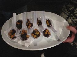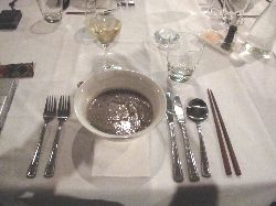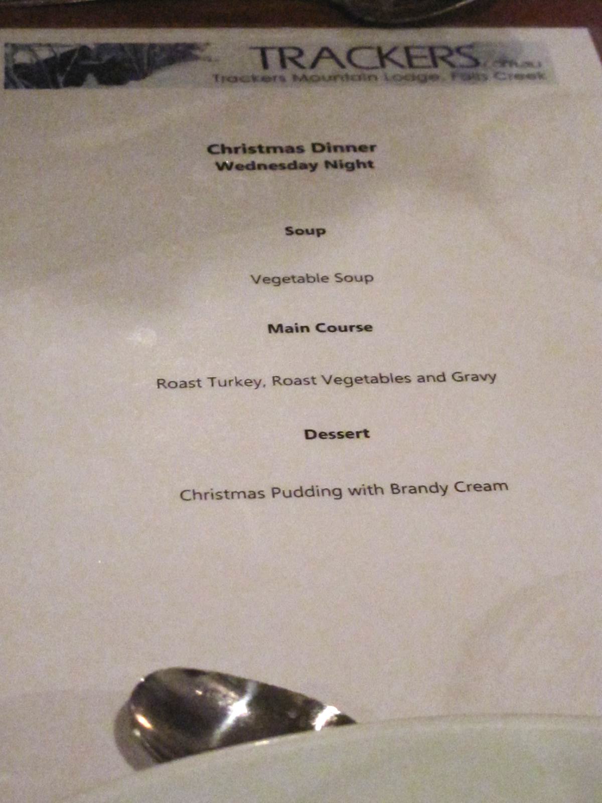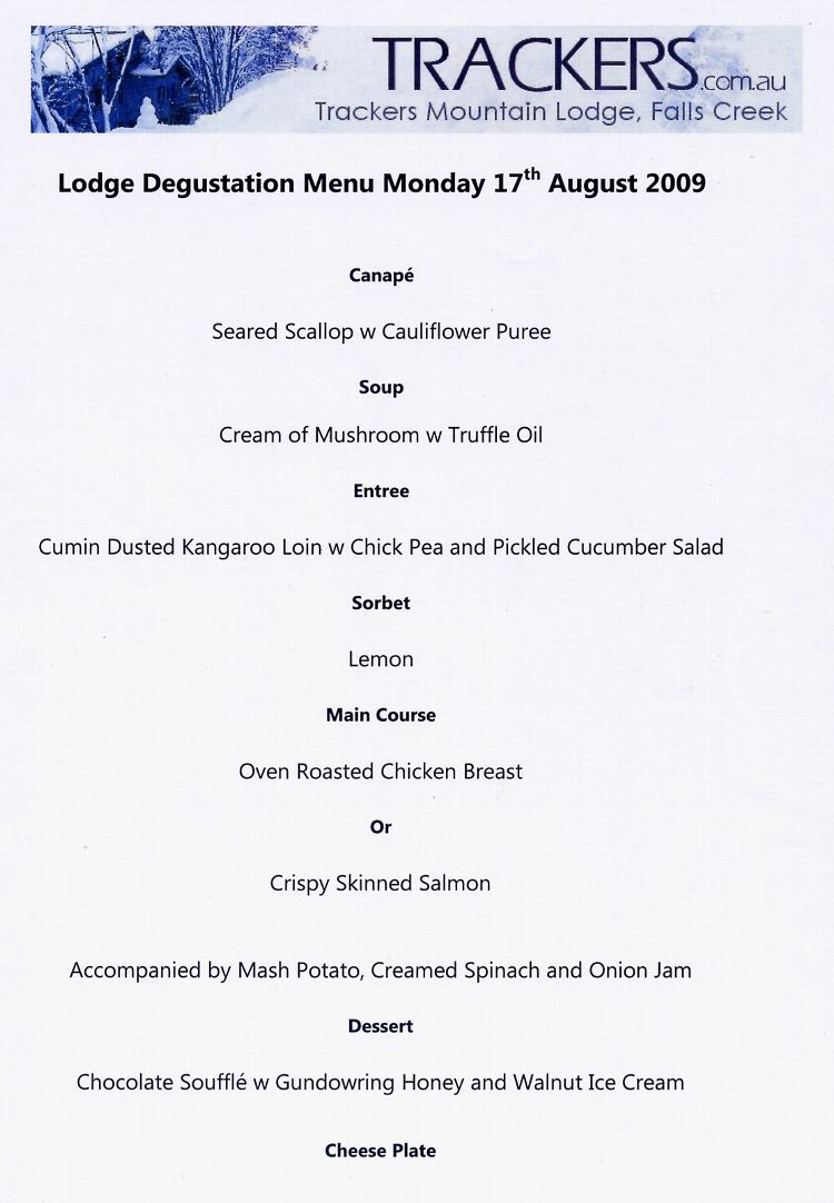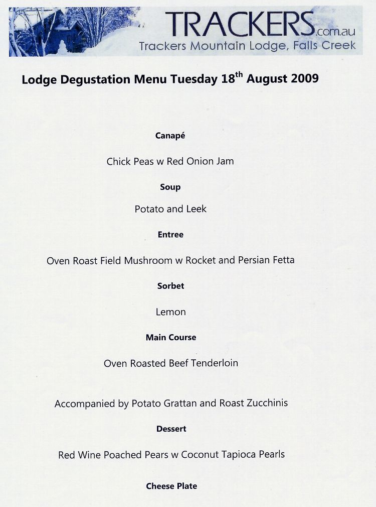 夕方になると、みんなバーの前に集まってきて、そこにコースメニューの一品目を配って歩きます。今ニューヨークのおしゃれなレストランなどで流行の前菜スタイルですね(^^ こちらがこの日のメニューです。中々豪勢でしょ(^^ FallsCreekではご飯が流行っているそうで、時々出て来るのが日本人にはうれしい(^^ |