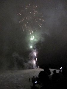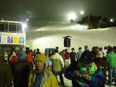 この日の夜は、地域の子供たちによるスキーイベントがあるそうなんですが、それに行ったら夕食はどうなるのかな?なんて思ってたら、流石アットホームホテル、食事が二部制になっていた(^^ 一部の食事をすませてゲレンデに出てみると、ピステンされたバーンとライトアップ、それに大音量で盛り上げる司会者。このビレッジのどこにこれだけに人数がいたのか?と思えるほどの観客、雰囲気がすごく楽しい!! |