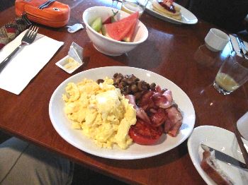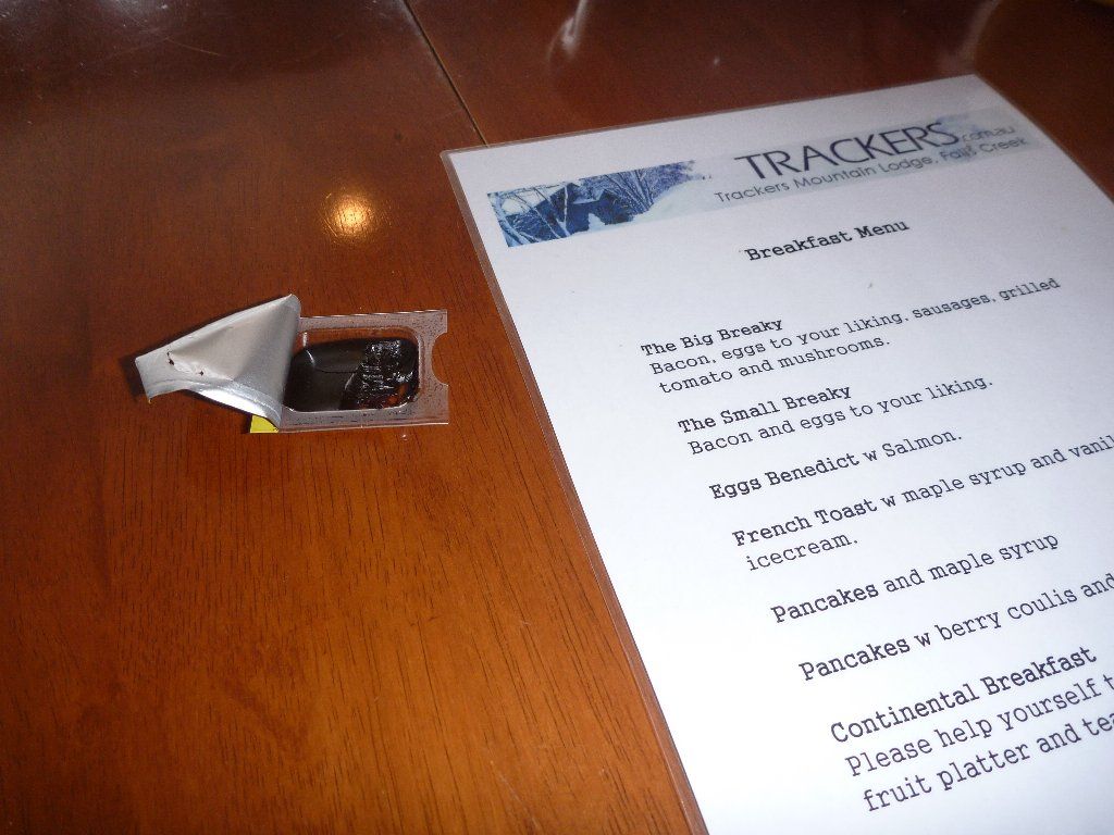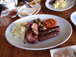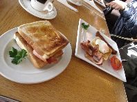 写真は宿のおかみさん。相変わらず暖かい方でした。おかみさんは朝食のホットミールを作ってくれます。以下がその写真で、メニューはこちらです。 メインは「ベーコンとソーセージ、焼きトマトと卵(焼き方は聞いてくれます)」のセットプレートで、スモールとビックがあります。でも、日本人にビックプレートは量的にちょっと大変かな? そんな中、おかみさんはくま用にビックプレートの二倍のプレートを作ってくれた〜(^_^ゞ下の写真を見比べるとわかるかな?