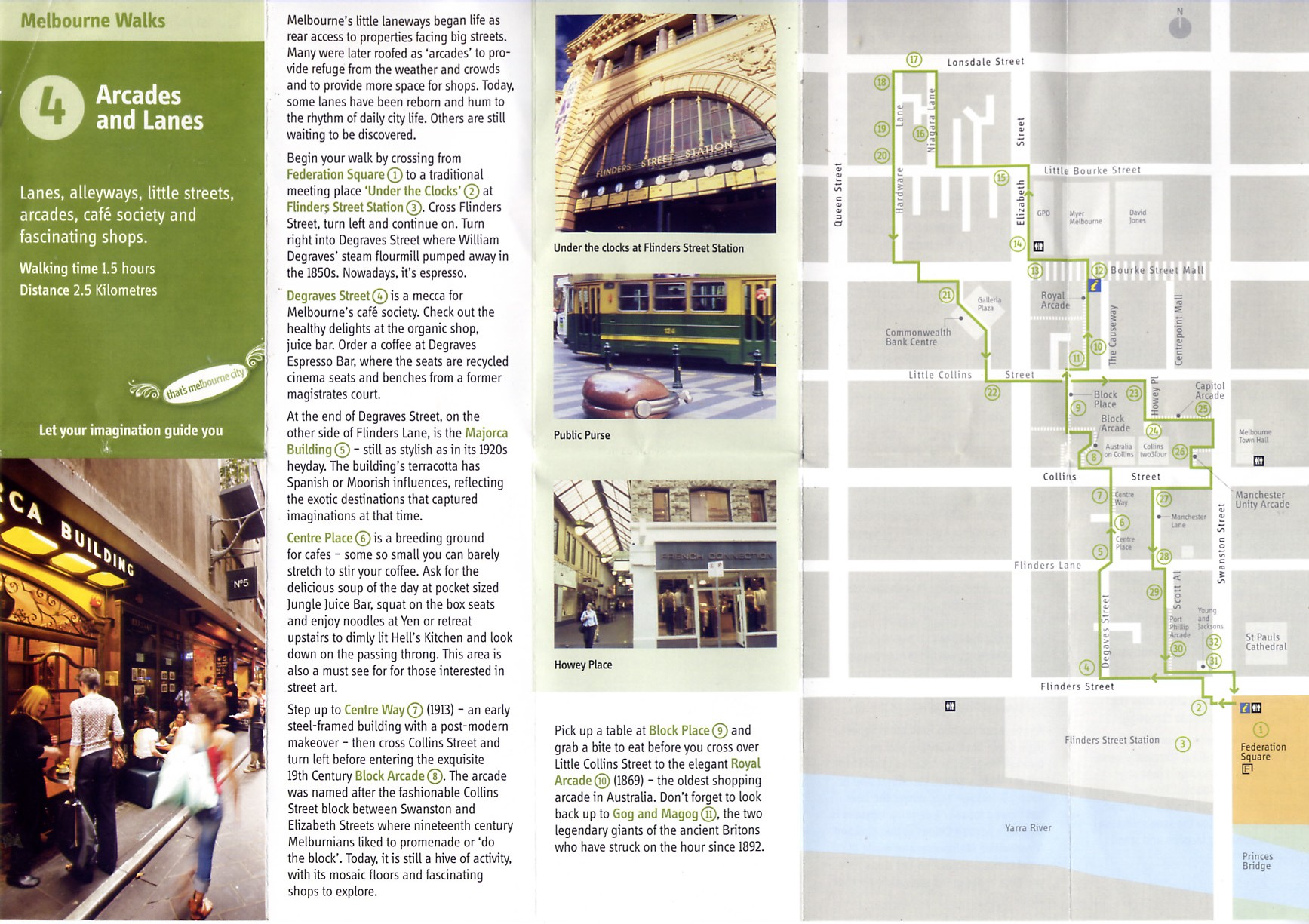 トラムを使って、やっとこさフリンダース・ストリート駅に到着早速駅前のインフォメーションにやってきました。![]() セントポールズ大聖堂とインフォメーション(右下) 行きたかったのはメルボルンらしい路地が残る(と言われている)LanewaysとRoyal Arcade & Block Arcadeという二つの通りです。そこでインフォメーションで聞いてみると、何と最初からこれらを散策するコースができているのね(^_^ゞ最初からここに来ればよかったと思いながらも、地図をもらって出発です。まずは、目の前のセントポールズ大聖堂からね。↑ 以前来た時には、こんなにビルに埋もれていなかったような気がするから、やはりここ数年のバブル経済の恩恵なのかな。自由に入れる内部もこんなに豪華だったかなぁ→なんて考えながら、荘厳な内装に釘付けになりました。 |