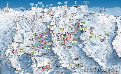夕べ遅くに遅れて到着した2名が合流し、この日からは10名体制。初日になる二人にはちょっとハードかもしれませんが、この日はエリアの中央で枝のように伸びるGRESSONEY LA TRINITEに向かいました。 モンテローザは三つの谷を横一で繋ぐように配置されたスキーエリア。地図で言うとシャンポルックは一番西の谷で、そこは真ん中の谷。 帰り道は24番のリフトでPunta