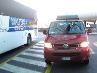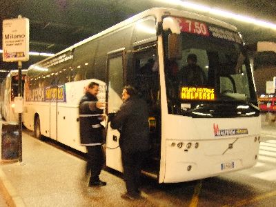 1月13日(金)快晴 考えてみれば、初日から晴れていた。 集合は成田空港第一ターミナル南ウイングIカウンター奥のスペース。使用するオーストリア航空はDカウンターなのになぜここか?実は成田空港がどんなに混んでいる時でも、ここだけはうそのように空いているから。(ナイショだよ(^_^ゞ) 全員無事に集合して、早速荷物を預けて出国手続きをします。実は今回からオーストリア航空の預け荷物は23Kg×2個+スキー用品(板+靴)が認められるようになり、まず重量オーバーする事がなくなりました。これには大助かりです 実はこの時史上最高クラスの円高で、1ユーロが何と約100円!でも経由地のウィーンで日本円をユーロに換金したメンバーがいたのですが、レートが悪いのと手数料が高いので、1ユーロ120円ぐらいになっちゃったみたい(T_T)やっぱり海外での現金入手は、クレジットカードのキャッシング(お金を借りる)がいいね。何たってレートそのままで、あとは手数料525円だけで済みますから(^^v ミラノの国際空港はマルペンサ空港。そこから市内までは←このシャトルバスを使います。70分ほどかかるけど、料金は7.5ユーロとよってもリーズナブル\(^o^)/バス乗り場も空港を出てすぐの場所にあって楽チン(^^
