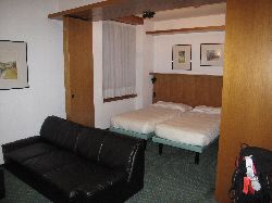 全員無事乗り込んでミラノ中央駅まで向かいます。 この日のお泊りは中央駅近くのUNA CENTURY、何と四つ星だぞ(^^v入り口はちょっとわかりずらいけど、夜だと←この看板が明るく光る目印になってわかりやすい(^^ ただ、ホテル自体が他のビルの中を抜けていくので、?って感じでしたが(^_^ゞまぁでもこの豪華さでバスタブまでついていてとってもリーズナブルなのがいいね(^^ |