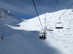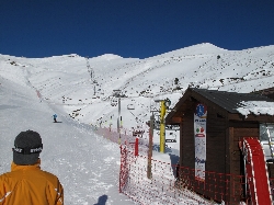早速長いメインゲレンデを滑り降りて唯一右端へと運んでくれるリフトに乗ろうとしたら...何と人を乗せたまま故障していて工具箱を持った係員が上から滑り降りてきて修理開始!
