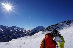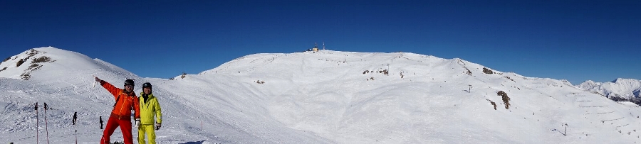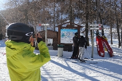 1月29日(月) 快晴 さぁ、今日はフランス側行くぞ〜♪ 早めに朝食を済ませ、ホテルの外のベンチでブーツを履いていると、何とここでもトラブル発生?!ブーツのヒンジ(くるぶしのネジ)がポロッと外れた\(_ _;) 自分で何とかしようともがいたけどダメで、Cesanaのゴンドラ乗場にあるショップで直してもらいました。お代は?って聞いたら、募金箱があるので、それに気持ちを入れてくれたらいいよって\(^o^)/ Cesanaからフランスと隣接するClaviereエリアに上る最初のリフト(40)は旧世代の二人乗りで、ここだけ時代に取り残されているようだ。それでも山頂へ向かう残りの2本のリフト(41・42)は最新式でColle Bercia 2293mまで運んでくれる。不思議なことにこちらのエリアは昨日と比べてすごく雪が良くて滑っていて楽しい。なので飛ばしてClaviete 1760mまで一気に滑り、最後にリフト一本(48)乗ると、そこがイタリア×フランスの国境でした。 そこからはフランスMontgenevreエリアです。まずは道路をまたぐゴンドラとリフトの混合(87)にに乗ってSerre Thibaud 2550mへ行ってみると、思いがけない絶景が広がっていました\(^o^)/ 一面にオープンスロープのバーンが広がり、全くさえぎるものがない。遠くに滑る人が米粒のように見える。何と人の矮小なことか。。 |